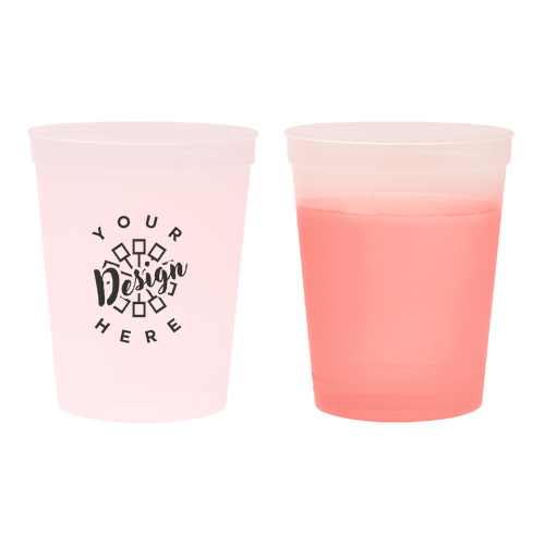 This is a sturdy, reusable, BPA-free polypropylene cup that changes color when ice-cold beverages are added. It is made in the USA, meets FDA requirements, and hand washing is recommended. It is available in various frosted colors that change to blue, orange, red, green, purple, or pink, with a closeout color of frost yellow. Optional natural-colored lids and straws are available, shipping separately and unassembled.