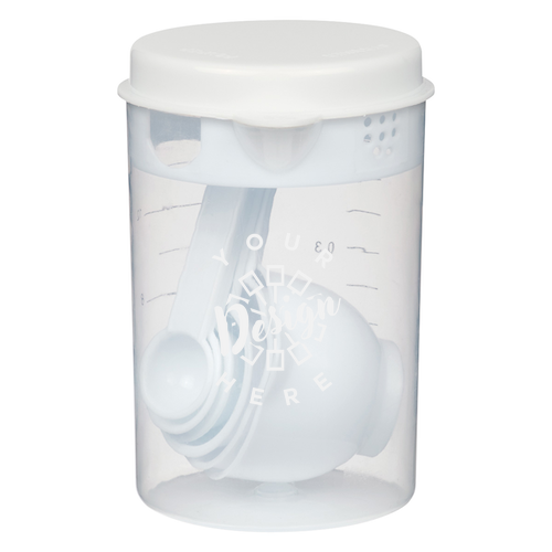 The 7-Piece Measuring Set is a convenient and space-saving kitchen essential, perfect for cooking and baking. This set includes measurements for 2 cups, ⅓ cup, ¼ cup, 1 tablespoon, ½ tablespoon, 1 teaspoon, and ½ teaspoon. The 2-cup container features ounce and liter markings and comes with a lid offering closed, strain, and pour options. Designed to nest neatly within itself for easy storage, this set meets FDA requirements, is BPA free, and hand wash recommended. Ideal for custom branding, it makes a practical promotional item for any kitchen or culinary event.