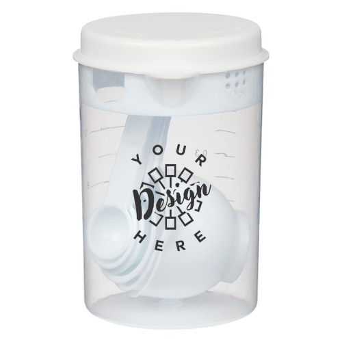 This product is a measuring cup set that includes seven common measurements and a 2-cup container with ounce and liter markings. The container has a lid with closed, strain, and pour options, and the set is designed to store within itself for space saving. It is BPA free, meets FDA requirements, and hand washing is recommended. The available colors are Blue, Red, or White, and the imprint area is 3" W x 2" H.
