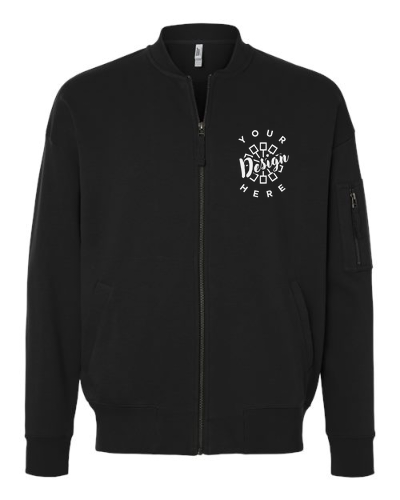 The American Apparel unisex French terry bomber jacket delivers premium comfort and elevated style, making it an excellent choice for custom apparel collections. Made from 9.4 oz./yd² 85/15 combed ring-spun cotton and polyester with fine 30 singles, it features a 100% cotton face for a soft feel and a smooth surface ideal for high-quality printing and decoration. Designed with a classic varsity collar, sleek black silver finish zipper with twill pull, functional sleeve pocket, and side pockets for everyday utility, this jacket blends fashion with function. The back neck patch and recycled tear-away label allow for easy customization, making it perfect for branded apparel with a modern, retail-inspired look.