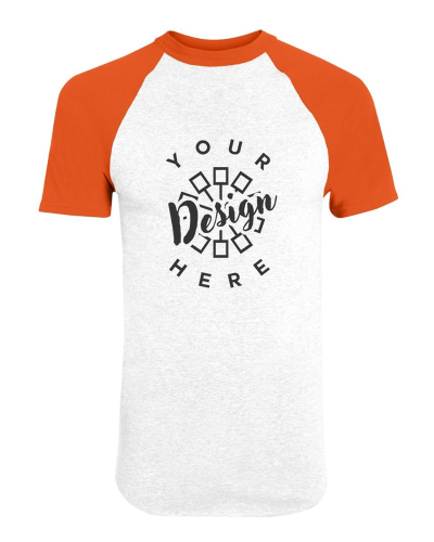 Crafted from a lightweight 4.8-ounce blend of 50% polyester and 50% cotton jersey knit, this shirt features a classic crew neck design. The contrast color neck and sleeves add a stylish touch, while the raglan sleeves offer enhanced mobility and comfort. Finished with a serged fishtail bottom for added detail.
