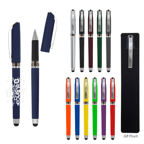 This is a cap action pen featuring a smooth rubberized finish, a stylus on top, and a rubber grip. It is available in a wide variety of colors, including black, forest green, gray, lime green, maroon, navy, orange, purple, red, royal blue, yellow, and metallic silver. The approximate size is 5 ¾" H, and it uses black gel ink refills with a medium point. The pen is packaged in a gift pouch, and assorted colors must be ordered in increments of 50.