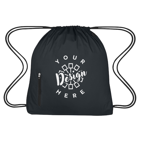 This bag is made of 1680 high-density pongee ripstop nylon and features a built-in slot for earbuds, a front zippered pocket, an inside pocket with hook and loop closure, heavy-duty cord straps, and a drawstring closure. The approximate size is 17" W x 20" H, and it is available in Black, Burgundy, Navy, Red, or Royal Blue. Imprint options include Silk-Screen, Transfer, or Embroidery, with available imprint areas of 9" W x 11" H or 4" Diameter. The product is packaged in bulk and has stock designs available.