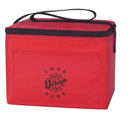 This is a budget cooler bag made of 210D Polyester with PEVA lining, featuring a zippered main compartment, a 20" web carrying handle, and a front slip pocket. It holds up to 6 cans and is spot clean/air dry only. The bag is available in a variety of colors including Gray, Yellow, Orange, Navy, Maroon, Lime Green, Light Blue, White, Red, Royal Blue, Purple, Forest Green, or Black. The approximate size is 7 ¼? W x 5 ½? H x 5 ½? D, with an imprint area of 5" W x 2 ½" H.