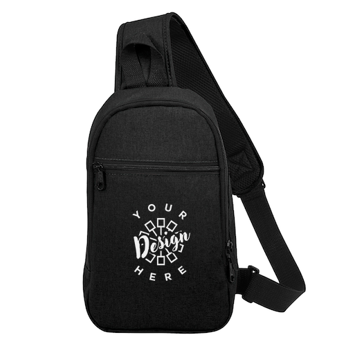 This product is a bag made of 300D Polyester Snow Canvas with a 210D Polyester Lining, featuring a double zippered main compartment and a large front zippered pocket. It includes an adjustable padded shoulder sling and a web carrying handle. Available colors are Black, Red, or Royal Blue, with Black and Royal Blue being made of recycled materials. The approximate size is 7" W x 11 ½" H x 2 ¾" D, and it supports silk-screen, transfer, and embroidered imprinting methods.
