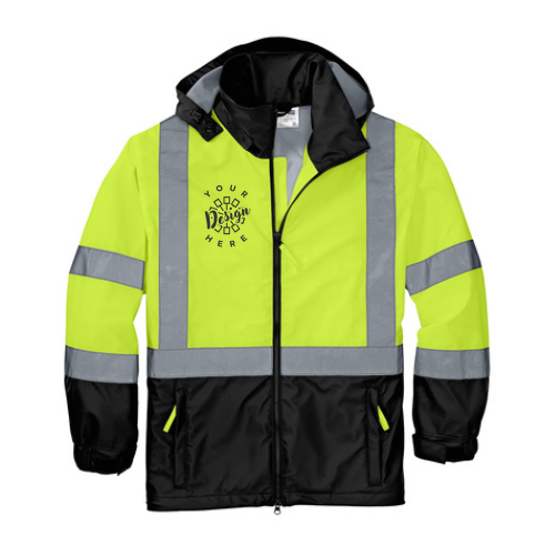 The CornerStone ANSI 107 Class 3 Safety Windbreaker delivers dependable protection and high visibility for workers in demanding outdoor environments. Made from 100% polyester with a water-resistant PU coating, this durable jacket provides an 8,000 mm waterproof rating and reliable weather defense. It features a detachable rain hood, full-length storm flap, adjustable tab cuffs with hook-and-loop closures, and a drawcord hem for a customizable fit. Two lower zippered pockets add functionality, while 2-inch reflective taping ensures 360-degree visibility that meets ANSI/ISEA 107 Class 3 safety standards. With its bright Safety Yellow body and black accent panels, this windbreaker offers both visibility and comfort—making it ideal for construction, transportation, and industrial crews who need professional-grade protection and customization-ready performance.