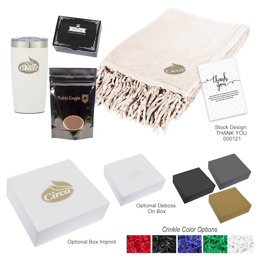 The Hit Promo Pamper Me Gift Set is the perfect wellness-inspired gift for relaxation and self-care, ideal for employee appreciation, client gifts, or event giveaways. This thoughtfully curated set includes the #85004 Cali Clay Cement Candle with a soothing scent and the #85010 Neck & Shoulder Wrap for comforting relief. Both items feature custom branding—1-color imprint on the candle and full-color imprint on the wrap. Packaged in a premium mailer box with crinkle stuffing, insert card, box label, and full kitting, this gift set is ready to impress. Personalize the insert card with your own message or choose from stock designs.