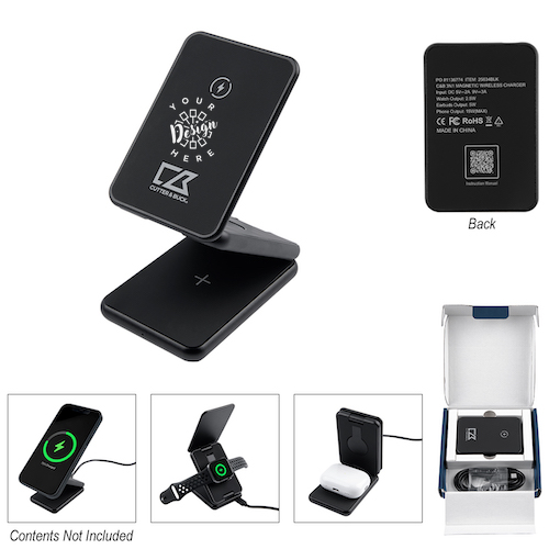 The Cutter & Buck 3-In-1 Magnetic Wireless Charger offers sleek, high-performance charging in a compact, travel-friendly design, making it ideal for custom corporate gifts and branded tech accessories. This versatile charging pad powers Qi enabled devices wirelessly and allows you to charge your phone, TWS true wireless stereo earbuds, and Apple Watch simultaneously. Internal magnets help properly align compatible iPhone 12 or newer models for efficient wireless charging, while FOD foreign object detection enhances safety. Featuring 15W, 3W, and 2W output levels, a Type-C input (cord included), and a non-slip base, it folds compactly for easy travel and storage. Finished with the signature Cutter & Buck logo, this premium wireless charger delivers standout branding potential for modern promotional merchandise.