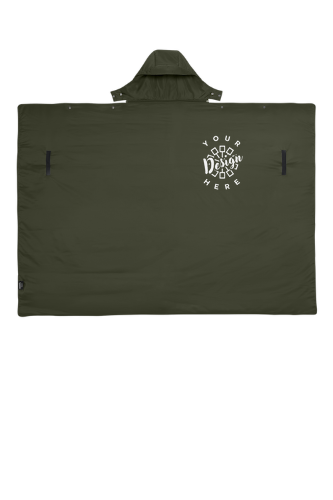 The Eddie Bauer Puffy Camp Poncho is a versatile and cozy layering essential, made from durable 100% polyester ripstop with a water-repellent finish and insulated with 4.7-ounce polyester fill. Designed for comfort and convenience, it features a detachable zippered hood with visor, elastic hand straps, and an attached toggled cinch sack for easy storage. Perfect for outdoor events, camping, or corporate gifting, it includes an embroidery access pocket and bold Eddie Bauer branding for custom decoration opportunities. Dimensions measure 50" x 70" (excluding hood).