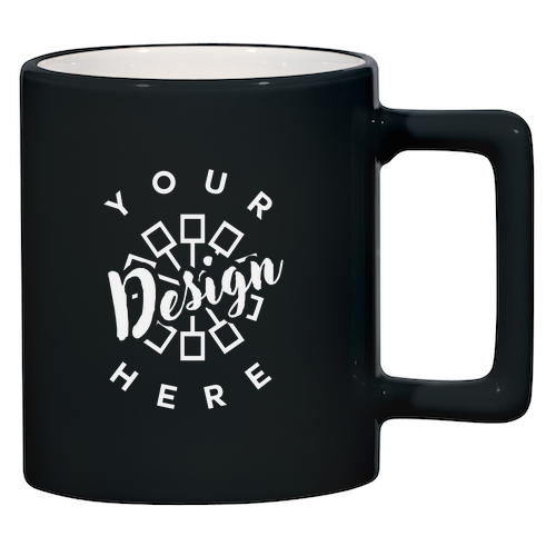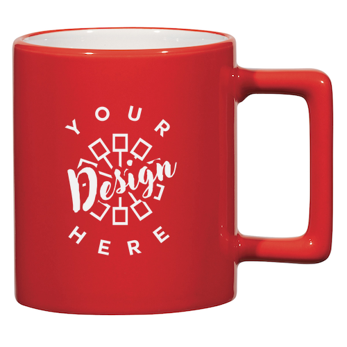 This product is a ceramic mug that meets FDA requirements and is recommended for hand washing only, not commercial use. It is available in Black, Cobalt Blue, Lime Green, Ocean Blue, Orange, Red, or White, all with a White Inner, and measures approximately 3 ¾" H. The imprint area is 3" W x 2 ¾" H, with a wraparound option available. Protective-Pack boxes are used for safe delivery, and the product has stock designs available.