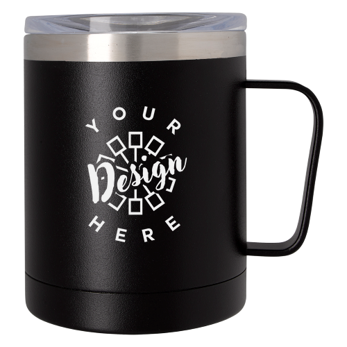 This is a vacuum-insulated, double-wall stainless steel mug with a powder-coated finish and a snap-on sip-through lid. It is BPA-free, meets FDA requirements, and hand washing is recommended. The mug is approximately 4 ½" H and available in Black, Blue, Gray, Light Blue, or White, with options for silk-screen or laser engraved imprinting. The lifestyle image and stock designs for the #5392 12 Oz. Concord Mug are available to view.