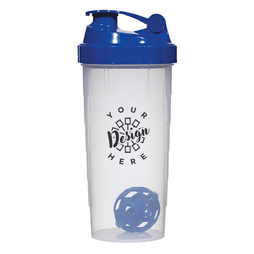 This product is a shaker bottle made of BPA-free polypropylene, featuring single-wall construction, a snap-on, spill-resistant flip-top lid, and a removable agitator ball for mixing powders or flavored beverages. It meets FDA requirements and hand washing is recommended. The bottle is approximately 9" H and is available in clear with a black or blue lid and mixer ball. Standard pricing includes a one-color imprint in one location, with optional 4-color process printing available.