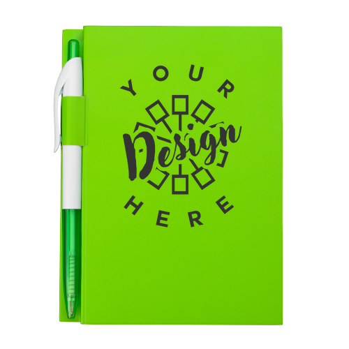 This is a 70-page lined notebook with a cardboard cover and a matching pen in a pen loop. The notebook is FSC® Certified, supporting responsible forestry. It is available in Blue, Lime Green, Red, Black, or White, and measures 4 ½" W x 6" H. Standard Silk-Screen Colors are used for imprinting on the notebook and an optional second position on the pen.