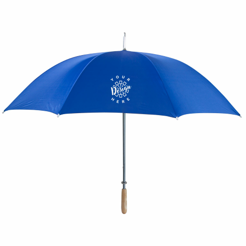 This is a manual open umbrella featuring an aluminum frame, wood grip handle, and polyester material, measuring 40" closed. It is available in various solid and two-tone color options, including some closeout combinations. The imprint area is 10" W x 6" H, and both silk-screen and transfer methods are available for standard imprint colors. Note that wood products are prone to color variances, and stock designs are available for this product.