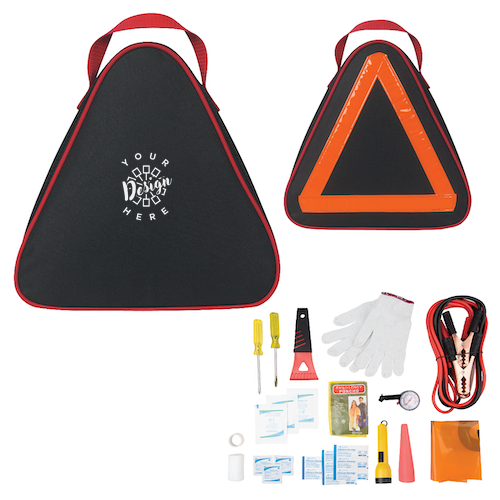 The Hit Promo Auto Safety Kit is a must-have for roadside emergencies, packed with essential tools including jumper cables, gloves, tire gauge, ice scraper, screwdrivers, first aid kit, poncho, SOS banner, flashlight, and emergency cone. Designed with reflective tape on the backside for added visibility, this kit also includes 2 AA batteries. Ideal for car dealerships, insurance companies, and safety promotions, it can be customized with your logo for high-impact brand exposure.
