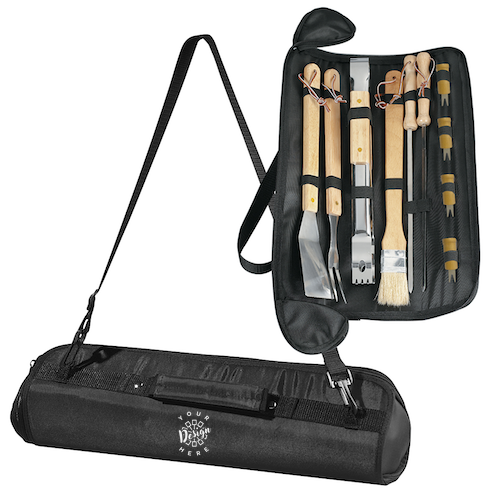 The Hit Promo BBQ Set is the perfect companion for outdoor grilling and cookouts. This complete set includes 2 skewers, 1 fork, 1 spatula, 1 pair of tongs, 1 brush, and 4 corn holders, all neatly organized in a convenient carrying case. Designed with a detachable and adjustable shoulder strap plus a padded web handle for easy transport, it offers comfort and portability. Meeting FDA requirements, this high-quality BBQ set makes an excellent promotional gift for outdoor events, corporate giveaways, or summer campaigns.