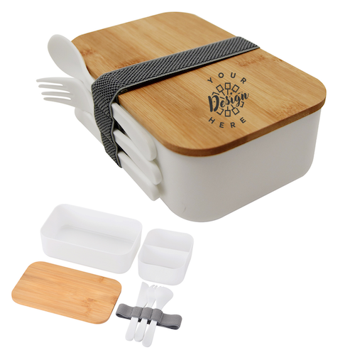 This is a bento box featuring a bamboo lid secured by an elastic strap and includes a plastic fork, spoon, and knife. It is BPA free, microwave safe, meets FDA requirements, and hand wash is recommended. The product supports responsible forestry and is FSC® Certified, meaning the forest-based materials are sourced from forests managed according to rigorous social and environmental standards. It is available in black or white with a gray strap.