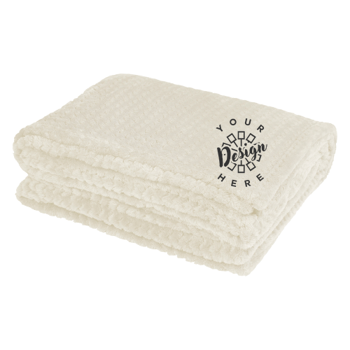 This is a large 55" x 60" blanket made of 100% polyester with a super soft feel and is surface washable. Available colors include Black, Cream, Gray, or Navy. The blanket can be imprinted with a 5" diameter area and offers embroidery options up to 7 thread colors and 5,000 stitches. Optional features include a storage bag and various patches.
