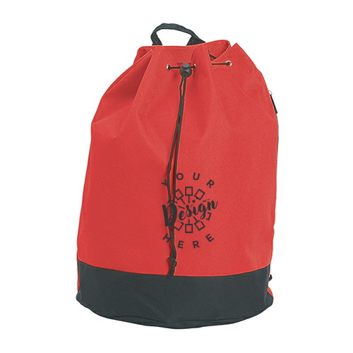 This item is a bag made of 600D Polyester with a PVC lining, featuring adjustable padded shoulder straps, a web carrying handle, and a drawstring closure. Available colors include Navy, Black, Red, or Royal Blue with Black Trim, and Green as a closeout color. It has an approximate size of 17" W x 15 ½" H x 12" D. Imprinting options include Silk-Screen, Transfer, and Embroidery, with specific area and method details provided.