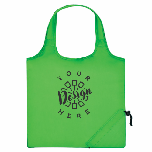 This product is a bag made of 210D Polyester that folds into a self-contained pouch with a string closure for convenient storage, featuring 18" handles. It is available in various colors, including some options made with recycled materials. The approximate size is 16" W x 14 ½" H, with a pouch size of 4 ½" W x 5" H, and an imprint area of 9" W x 8" H. Standard Silk-Screen or Transfer Colors are available for imprinting, and the product is packaged in bulk.