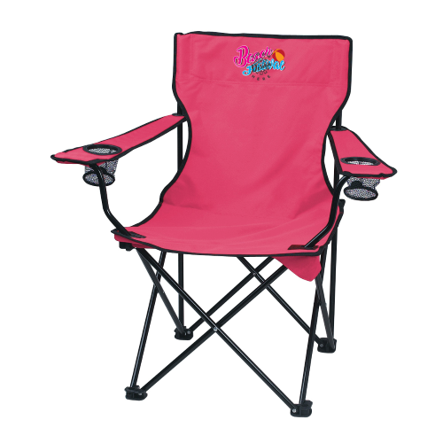 This is a description for a folding chair made of 600D polyester with a steel tubular frame, featuring a 300 lbs weight limit and 2 mesh cup holders. It comes with a 600D polyester drawstring carrying bag with a shoulder strap. The chair is available in multiple colors, including options made with recycled materials, and has an approximate size of 32" W x 34" H x 20" D. The imprint area is 12" W x 3 ¼" H on either the chair front, chair back, or bag, and standard transfer colors are used for imprints.