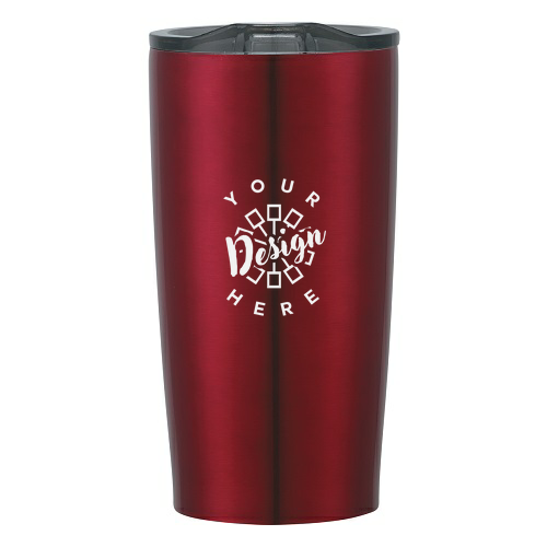 This product is an 18 oz. stainless steel double-wall tumbler with vacuum insulation, designed to keep drinks hot or cold for up to 6 hours. It features a snap-on, spill-resistant lid with a rubber gasket, is BPA free, and meets FDA requirements. The tumbler comes in various colors and lid options, including some made from recycled materials, and is approximately 7" H. Multiple imprint and personalization methods are available, such as silk-screen, 4-color process, and laser engraving.