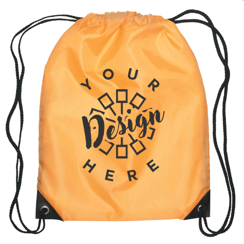 This product is a drawstring bag made of 210D polyester with contrasting simulated leather reinforcement black trim at the corners, featuring reinforced eyelets and a drawstring closure. It is available in multiple colors including Athletic Gold, Black, Forest Green, Lime Green, Navy, Orange, Purple, Red, or Royal Blue, some of which are made with recycled materials. The approximate size of the item is 17" W x 20" H, with an imprint area of 10" W x 10" H. Care instructions are spot clean/air dry, and the product is packaged in bulk.