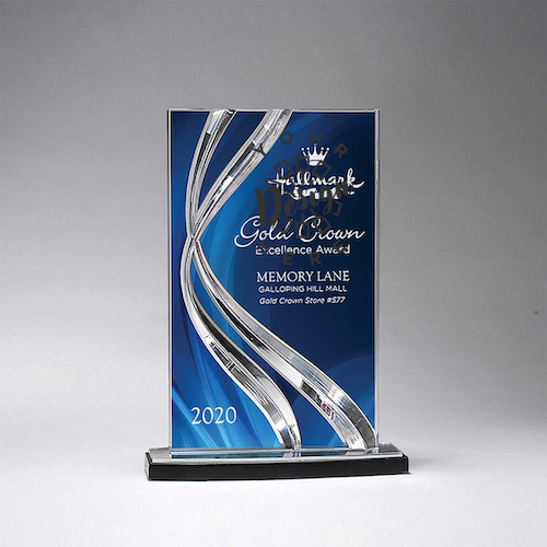 This product is a Lucite Acrylic award, made in the USA. It is available in clear with blue and ships unassembled, but can be requested assembled. The approximate size is 6 ¼" W x 8 ½" H, with an imprint area of 2 ½" W x 3 ½" H, which laser engraves frost. Production time is 6 to 9 days after proof approval, and the item is individually packaged in a standard presentation box.