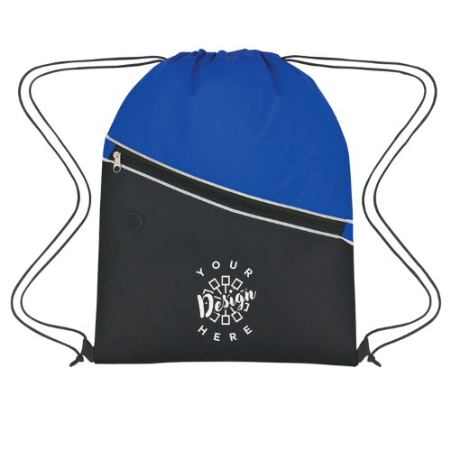 This item is a water-resistant drawstring bag made of 80-gram non-woven, coated polypropylene. It features a large front zippered pocket and a built-in slot for earbuds. The approximate size is 13 ½" W x 17 ¾" H, with an imprint area of 9" W x 4 ½" H. Available colors include Black, Forest Green, Navy, Red, Royal Blue, or Yellow, all with Black Trim.