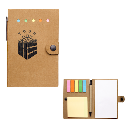 The Hit Promo Small Snap Notebook with Desk Essentials is a compact and practical choice for meetings, classes, or giveaways. It includes a 50-page unlined notebook with a kraft paper cover, a matching pen with a paper barrel, and a built-in pen holder in the spine for easy access. Stay organized with included sticky notes and five neon-colored sticky flags. Perfect for custom branding, this eco-friendly notebook set is a smart promotional item for any business or event.