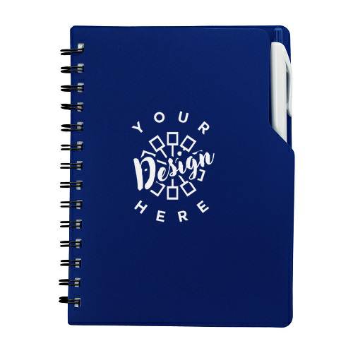 This is a 100-page lined notebook with a polypropylene cover and a matching pen in an elastic loop. The product is FSC® Certified, supporting responsible forestry. It is available in solid black and frosted blue and measures 6" W x 7 ¾" H. Imprint areas are available on both the notebook and optionally on the pen.