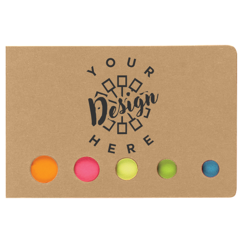 This product is Sticky Flags in 5 neon colors, contained in a compact case. The case is available in Black, Blue, Natural, Red, or Silver. The approximate size is 3 ¼" W x 2 ¼" H, with an imprint area of 2 ½" W x ¾" H, using standard pad-print colors. The product is packaged in a Cello Bag and has Stock Designs available.