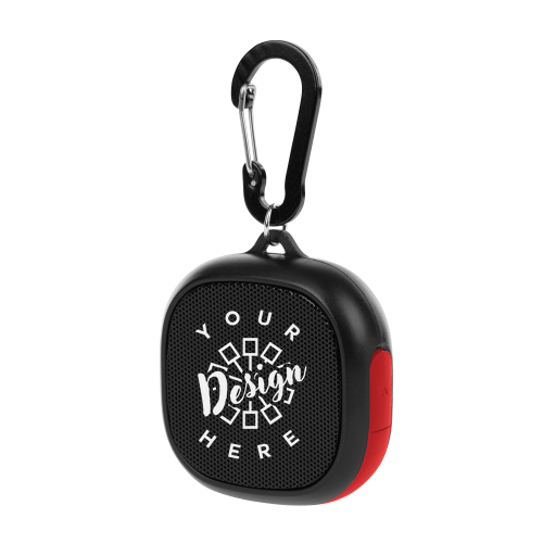 This is a waterproof wireless speaker featuring High Definition Bluetooth 5.0 wireless technology for dynamic stereo sound. It includes a carabiner attachment, a 200mAh Lithium Polymer battery, and a Type-C input cord. The speaker pairs from up to 30 feet away and provides up to 2 hours of play time, making it perfect for home, office, or outdoor activities. It is available in Black with Blue, Red, or White accents, and comes packaged in a gift box.