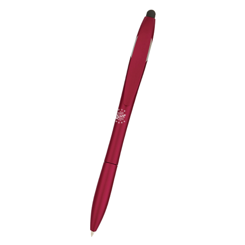 This is a twist action pen with a stylus on top and a cap that bends over to create a phone stand. It is approximately 5 ½" H and available in metallic colors including Black, Blue, Lime Green, Orange, Purple, Red, or Teal, all with Silver Trim. The pen uses black ink with a medium point and is packaged in bulk. It has an imprint area of 1 ½" W x ½" H and supports a multi-color imprint with a maximum of two colors.