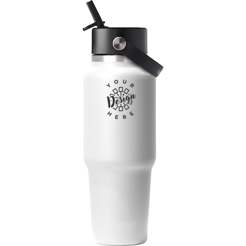 The Hydro Flask Travel Bottle with Flex Straw Cap 32oz keeps drinks cold for up to 24 hours and hot for up to 12 with TempShield® double-wall vacuum insulation. Designed with a leakproof Flex Straw Cap (not intended for hot liquids), this bottle features a wide mouth opening that’s ice-cube friendly and easy to clean. Made from durable stainless steel with no flavor transfer, it’s BPA-free and fits most cup holders, making it perfect for custom branding or everyday hydration. Not for use on a stove, in a microwave, or freezer.