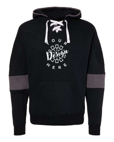 The J. America Sport Lace Colorblocked Fleece Hooded Sweatshirt combines style, comfort, and durability. Made from a 10 oz./yd², 80/20 cotton/polyester fleece blend, this hoodie features double-needle stitching for long-lasting wear. The jersey-lined hood with contrast trim and the split front placket with metal eyelets add a modern touch. It also includes a set-in pouch pocket, 2x2 ribbed cuffs and waistband, and contrast-color sleeve panels for added flair. The tear-away label and interchangeable custom-color laces (sold separately) make it easy to personalize. Perfect for custom apparel and team wear.