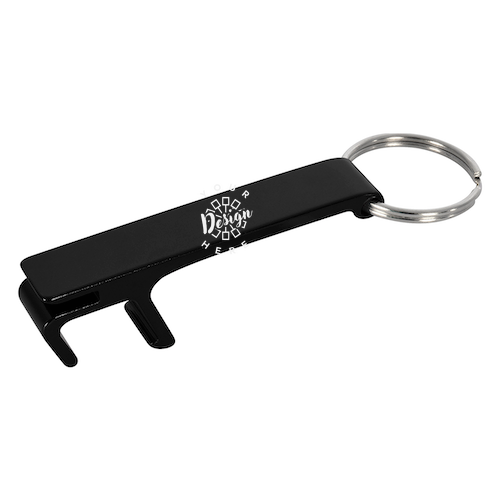 A smart, multi-function everyday carry. This key chain features a secure split ring attachment, built-in metal bottle opener, and a convenient phone holder that supports a variety of phone sizes for easy hands-free viewing.