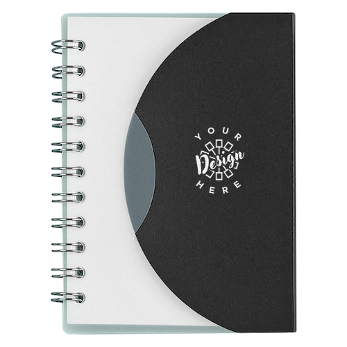 This is a 60-page lined notebook with a polypropylene cover, supporting responsible forestry and is FSC® Certified. It is available in frosted lime green, orange, white, purple, red, blue, or black. The approximate size is 3 ¼" W x 4 ¼" H, and it supports standard silk-screen imprint colors with an area of 1" W x 1" H. Multi-color imprints (maximum two colors) are also available, and the product is packaged in bulk with stock designs available.