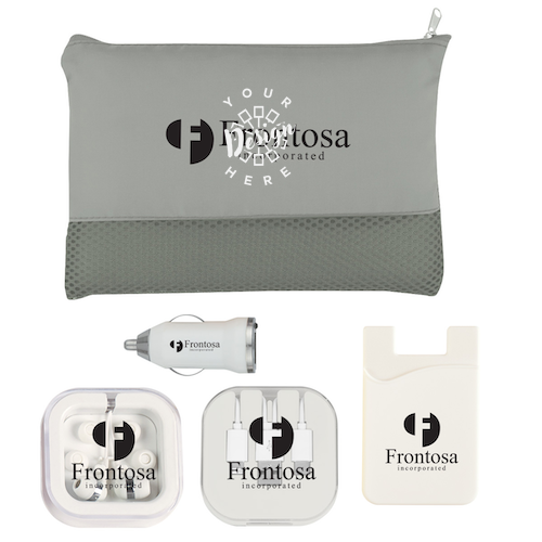 Stay connected wherever you go with our On-The-Go Tech Essentials Kit, the perfect promotional gift for modern professionals and travelers. This convenient set includes a #9451 Mesh Vanity Bag, #2700 Earbuds in Case, #2600 On-The-Go Car Adapter, #2933 3-in-1 Charge Cable with Phone Stand, and #227 Silicone Phone Wallet. Ideal for trade shows, employee gifts, or client giveaways, this customizable tech kit keeps your devices charged, organized, and ready for anything. Add your logo for a practical and stylish branded accessory.