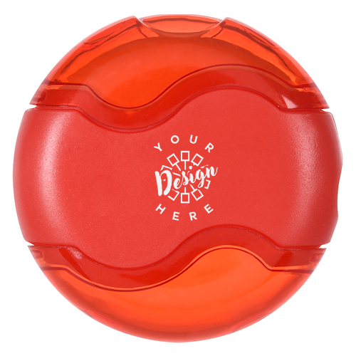 This is a handy pencil sharpener that collects shavings and has an eraser on the other end. It is available in blue, red, or white, and the imprint is done using standard silk-screen colors. The approximate size is 1 7/8" in diameter, with an imprint area of 1 1/8" W x 3/8" H. It is packaged in a cello bag, and stock designs are available.