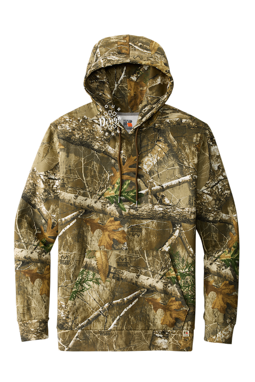 Russell Outdoors Realtree Pullover Hoodie crafted from durable 8.4-oz ring spun cotton/poly blend for all-day comfort. Features Realtree EDGE® camo print, tag-free label, metal grommet hood with tipped drawcords, front pouch pocket, and a woven Russell Outdoors™ hem tab—perfect for outdoor and casual wear.