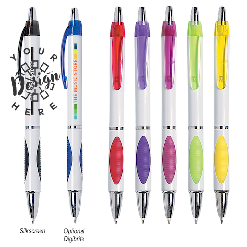 The Sassy Pen is a stylish and practical promotional item designed for comfort and ease of use. Featuring a plunger action for smooth writing, this pen includes a rubber grip that ensures enhanced writing comfort and control, making it perfect for long writing sessions. Its sleek design and functional features make it a great choice for custom branding, whether for corporate giveaways, trade shows, or promotional events. The Sassy Pen offers a memorable and practical way to keep your brand in front of customers every day, combining style with functionality for an exceptional writing experience.