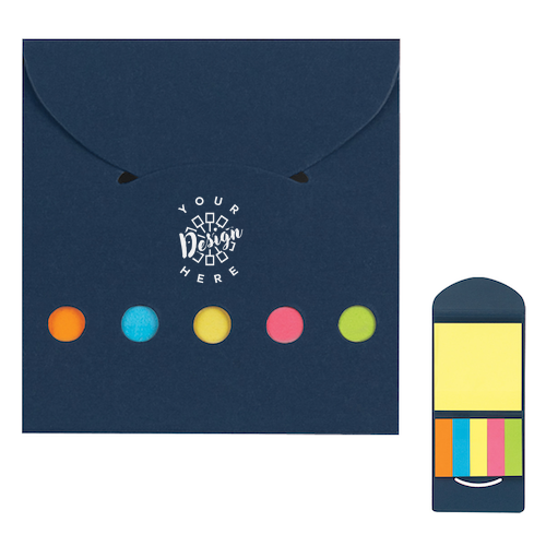 This product includes sticky notes and sticky flags in five neon colors, housed in a compact case with a tuck-in closure. It is available in Black, Blue, Natural, Red, Silver, or White, and can be imprinted using standard Silk-Screen Colors or the Digibrite Process. The approximate size is 3 ¼" W x 3 ¼" H, with an imprint area of 2" W x ½" H. The item is packaged in a Cello Bag and stock designs are available.