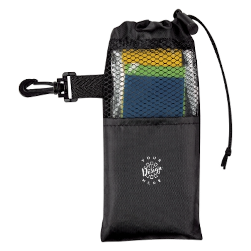 This product is a Strength Resistance Band Set that includes three exercise bands with varying resistance weights: Green (2-4 Lbs.), Blue (6-8 Lbs.), and Yellow (10-12 Lbs.). The set comes with a Nylon Mesh Pouch with a clip and drawstring closure. The bands are available in black, and standard silk-screen colors are available for imprinting on the pouch, which has an approximate size of 3 ?" W x 7 ½" H. Packaging is bulk, and multi-color imprints are not available.