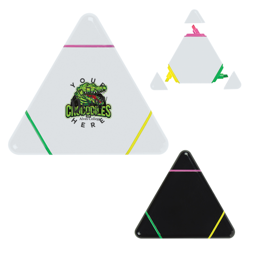 This product is a 3-in-1 highlighter with green, pink, and yellow colors, made of recycled ABS plastic. The body is available in white or black. Imprinting options include standard silk-screen colors or the Digibrite process, with options for multi-color and second-side imprints. The approximate size is 3 ½" H, and it is packaged in a cello bag.